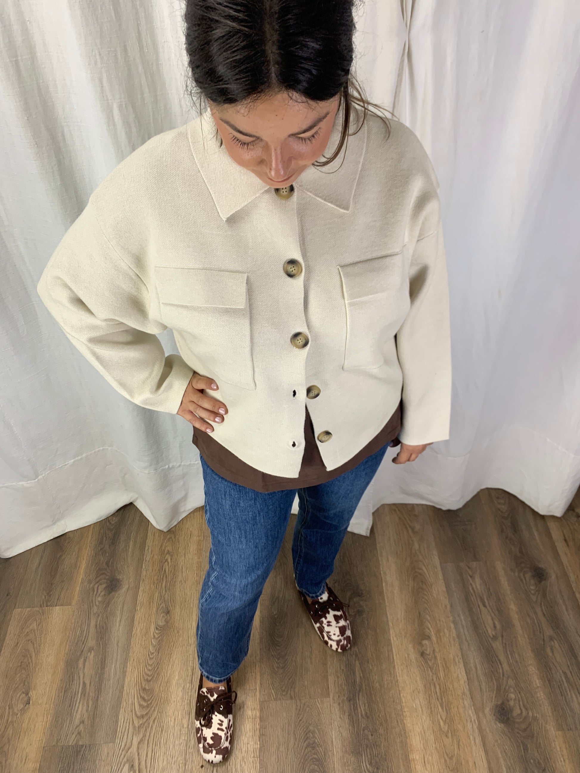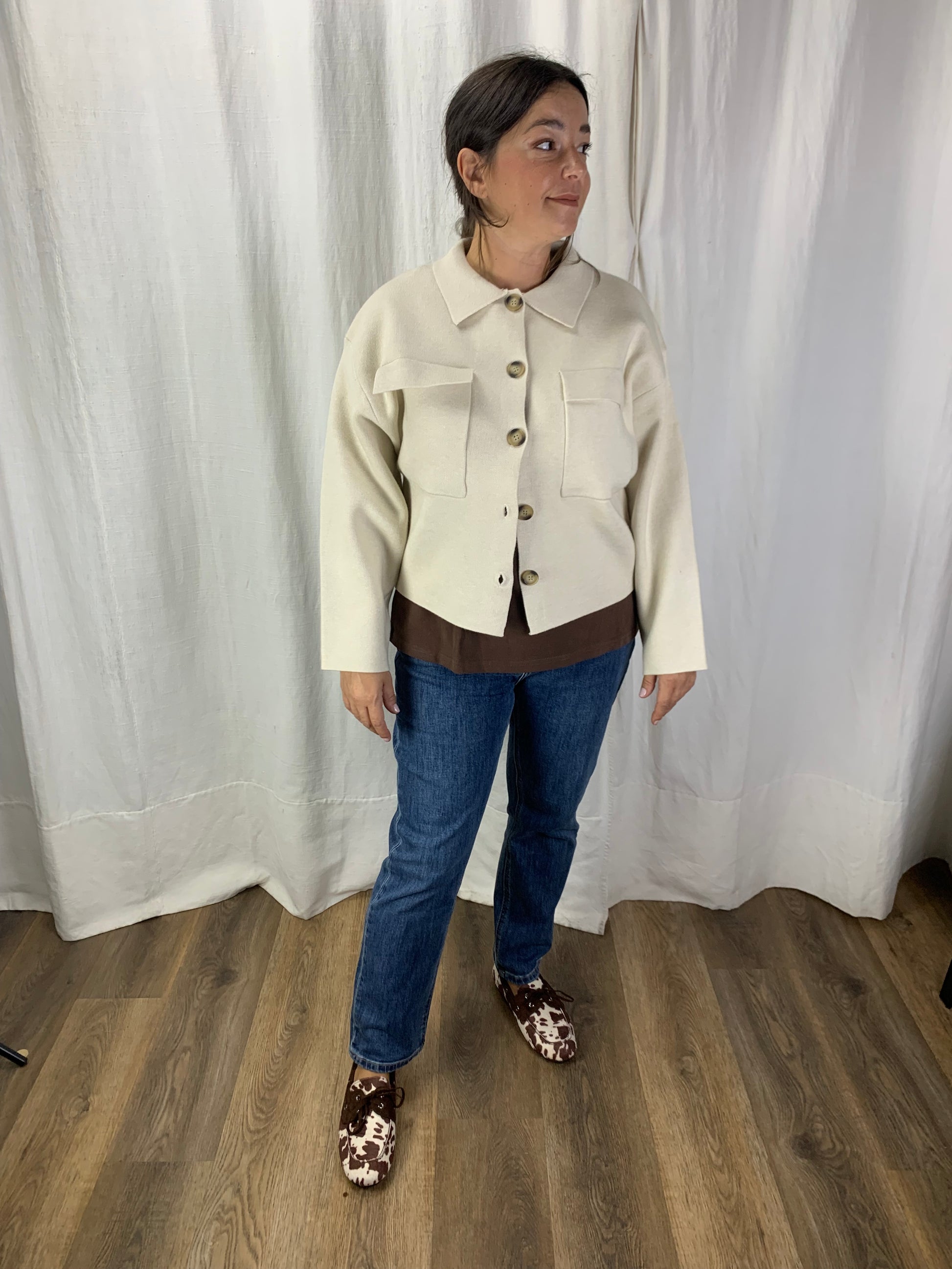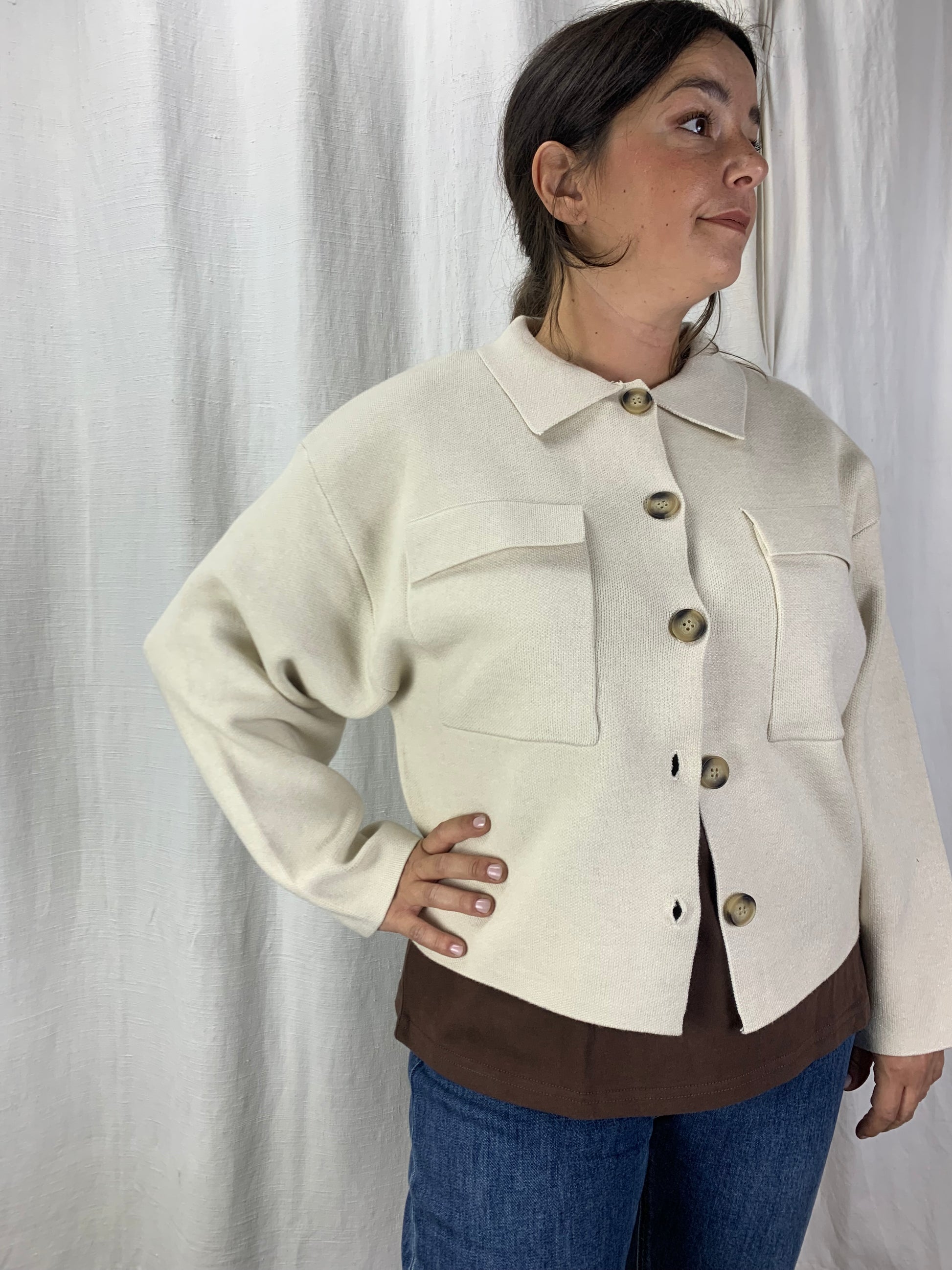 Una forma a giacca ma della sostanza di un maglione. Maglia rasata in una morbida viscosa se vuoi una giacca ma senza la rigidità tipica di un capospalla