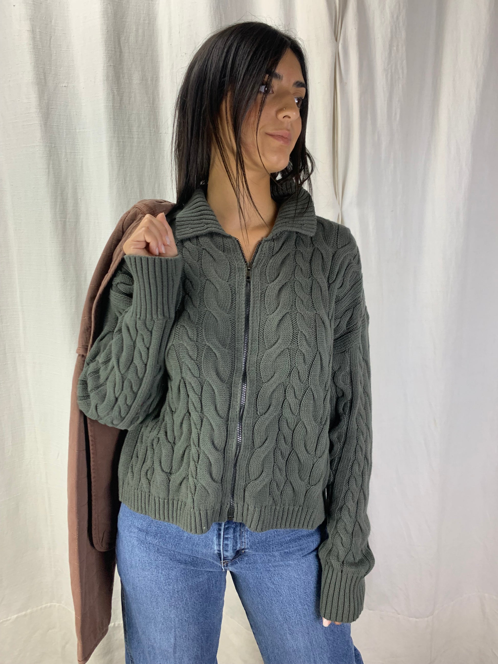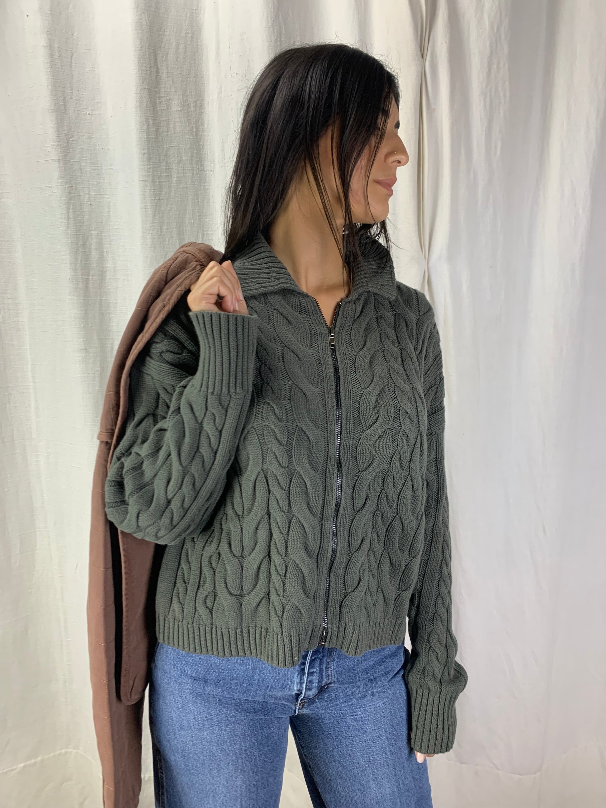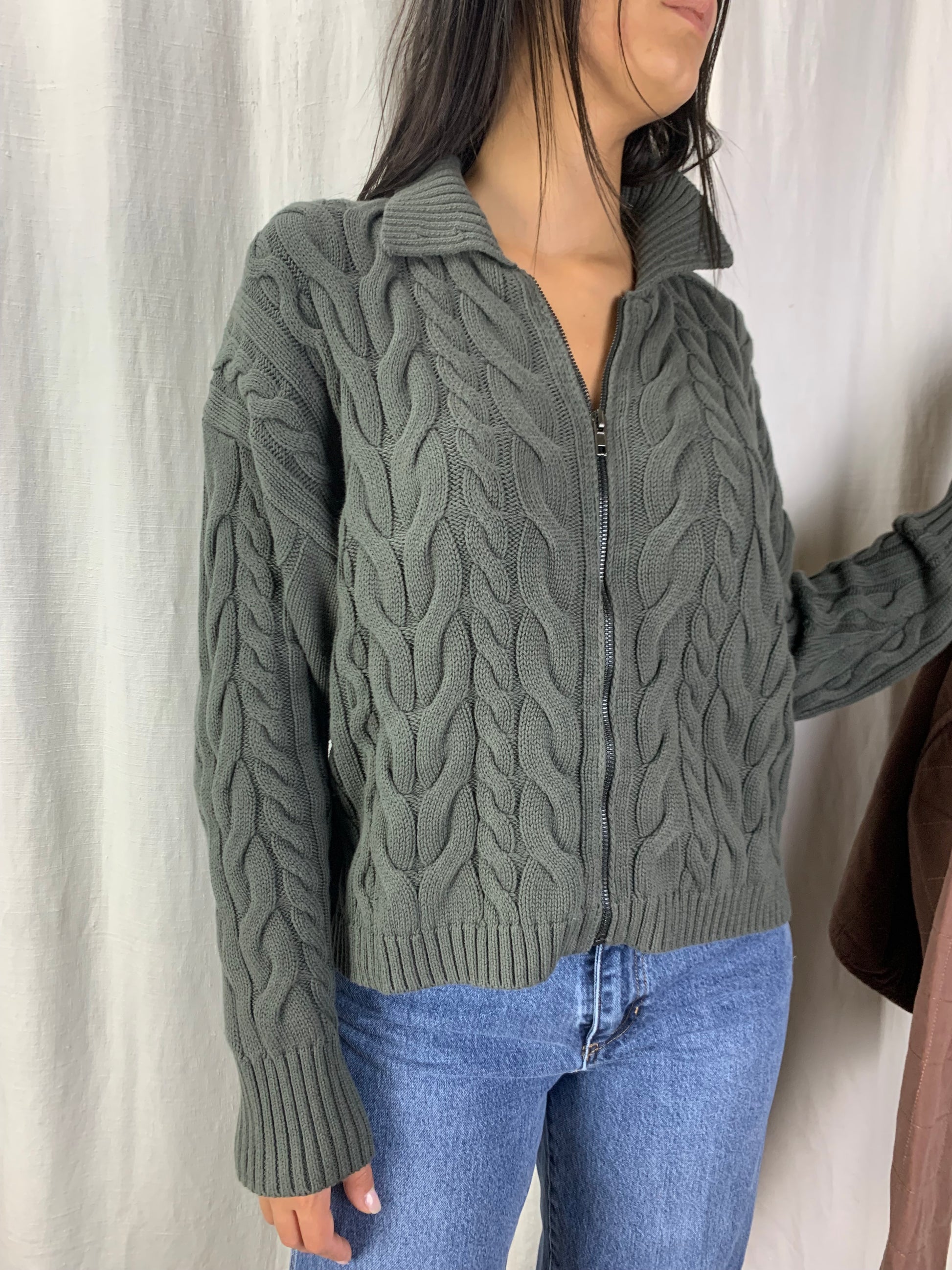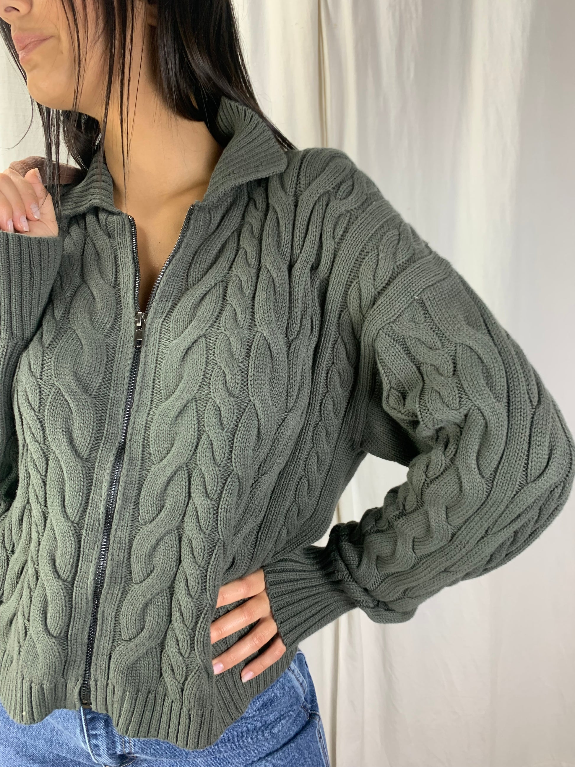 Golf con collo alla maria stuarda se aperte ,chiuso è un collo alto,tipo nelle trecce stile baita anni 80 moderno nel colore verde bosco. Nei primi freddi si può portare anche aperto