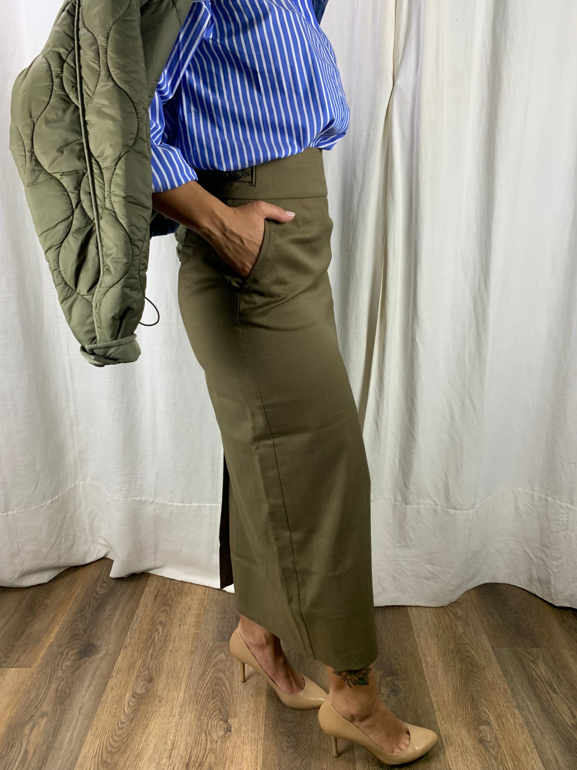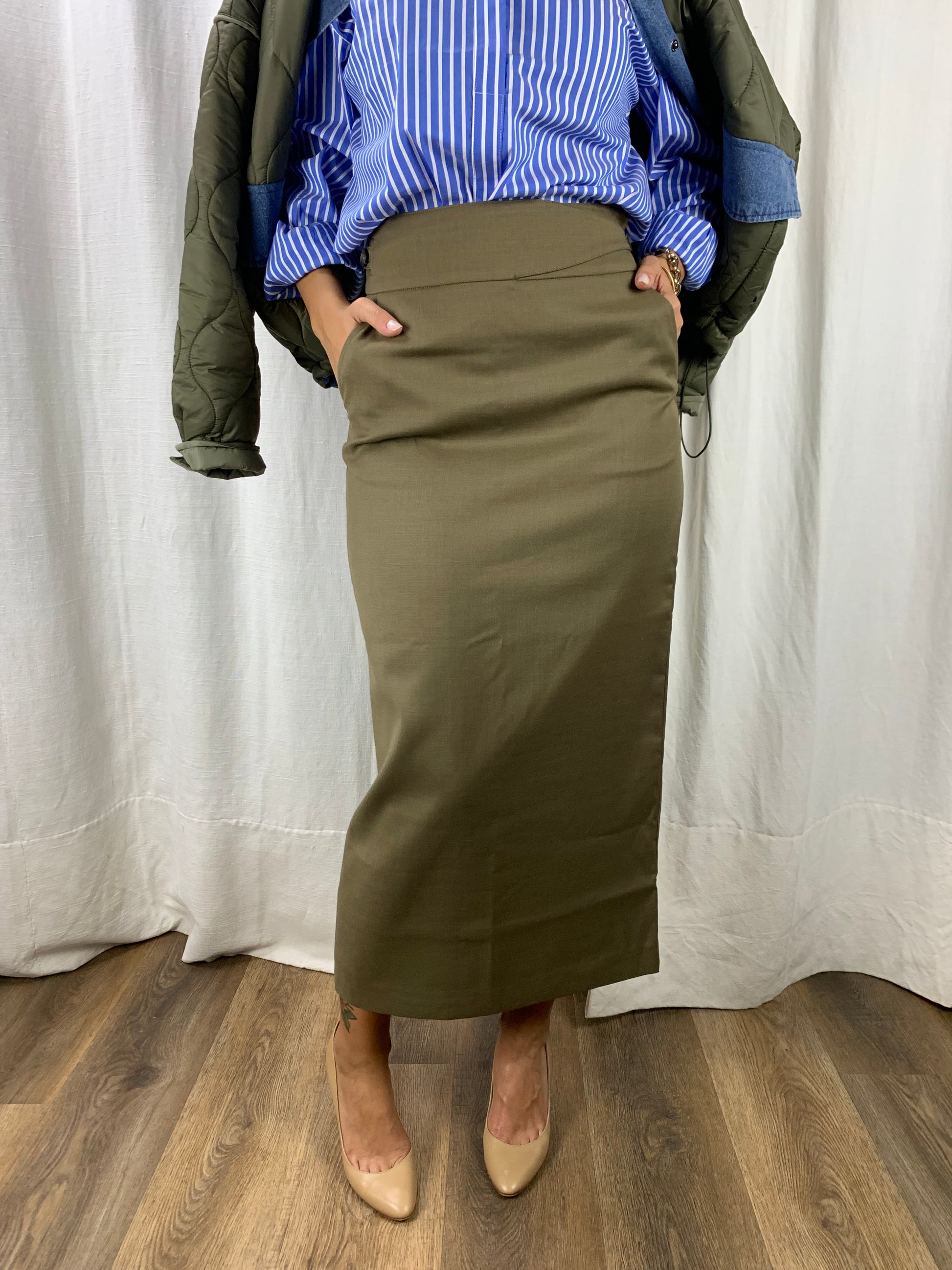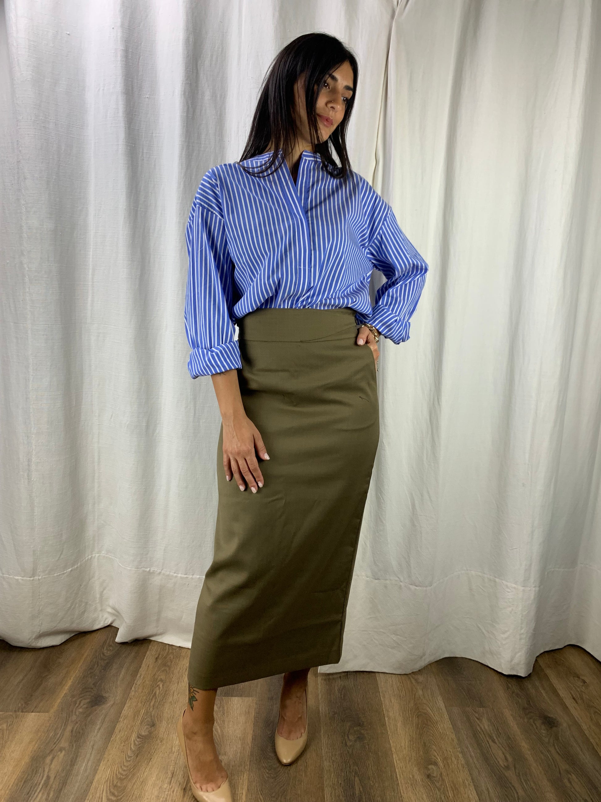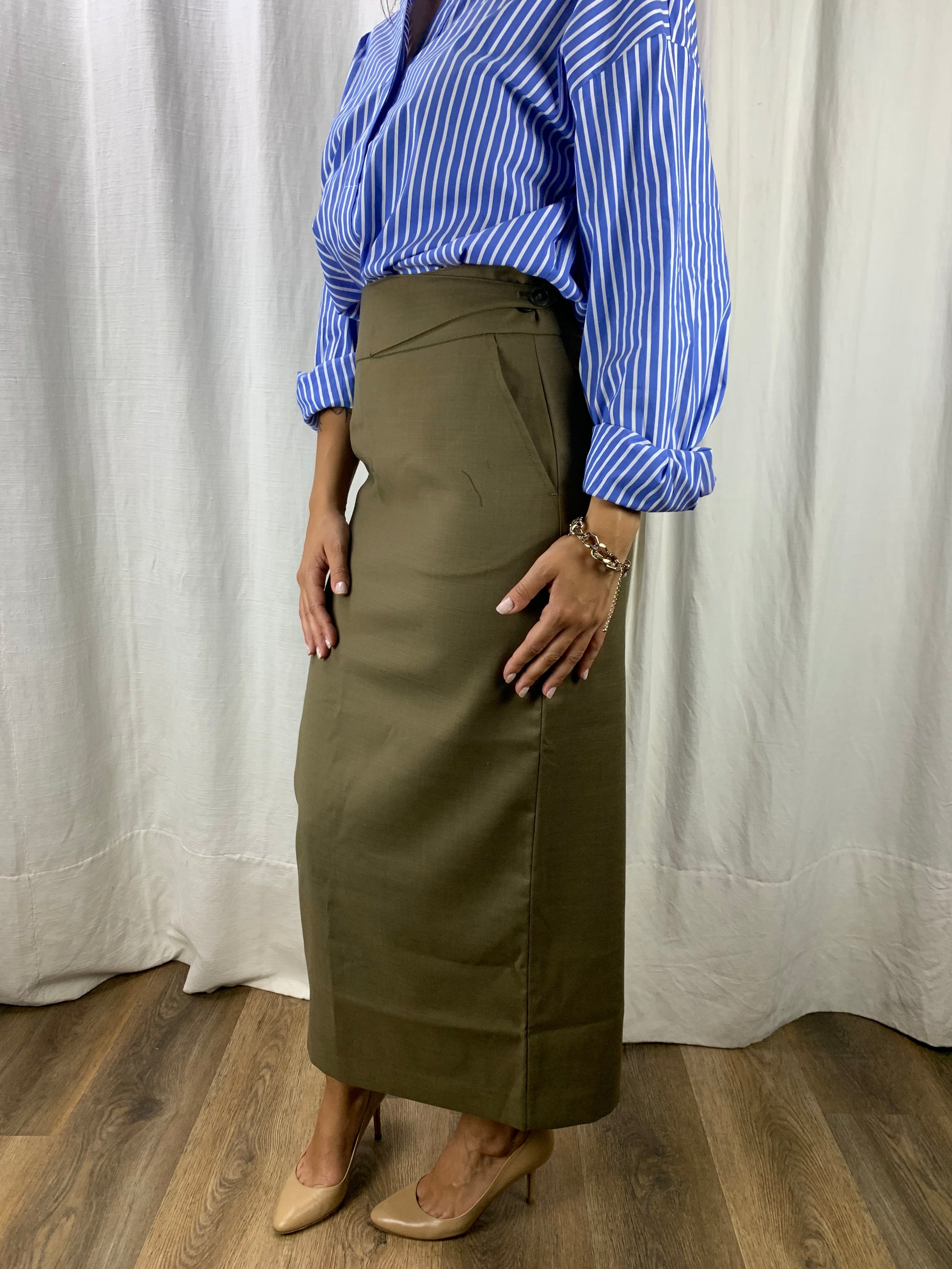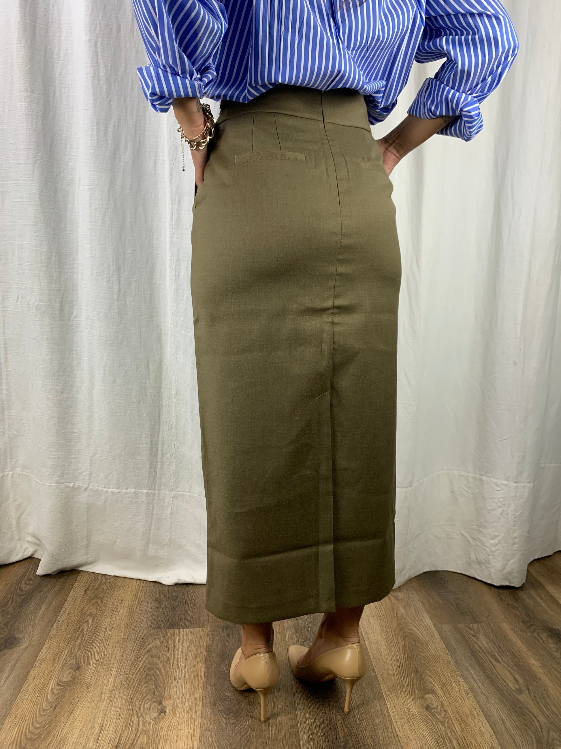 Una gonna a matita ,mille dettagli : lo spacco nel retro super femminile e elegante nonché super pratico,il cinturino regolabile in vita tramite bottoni,e le tasche!