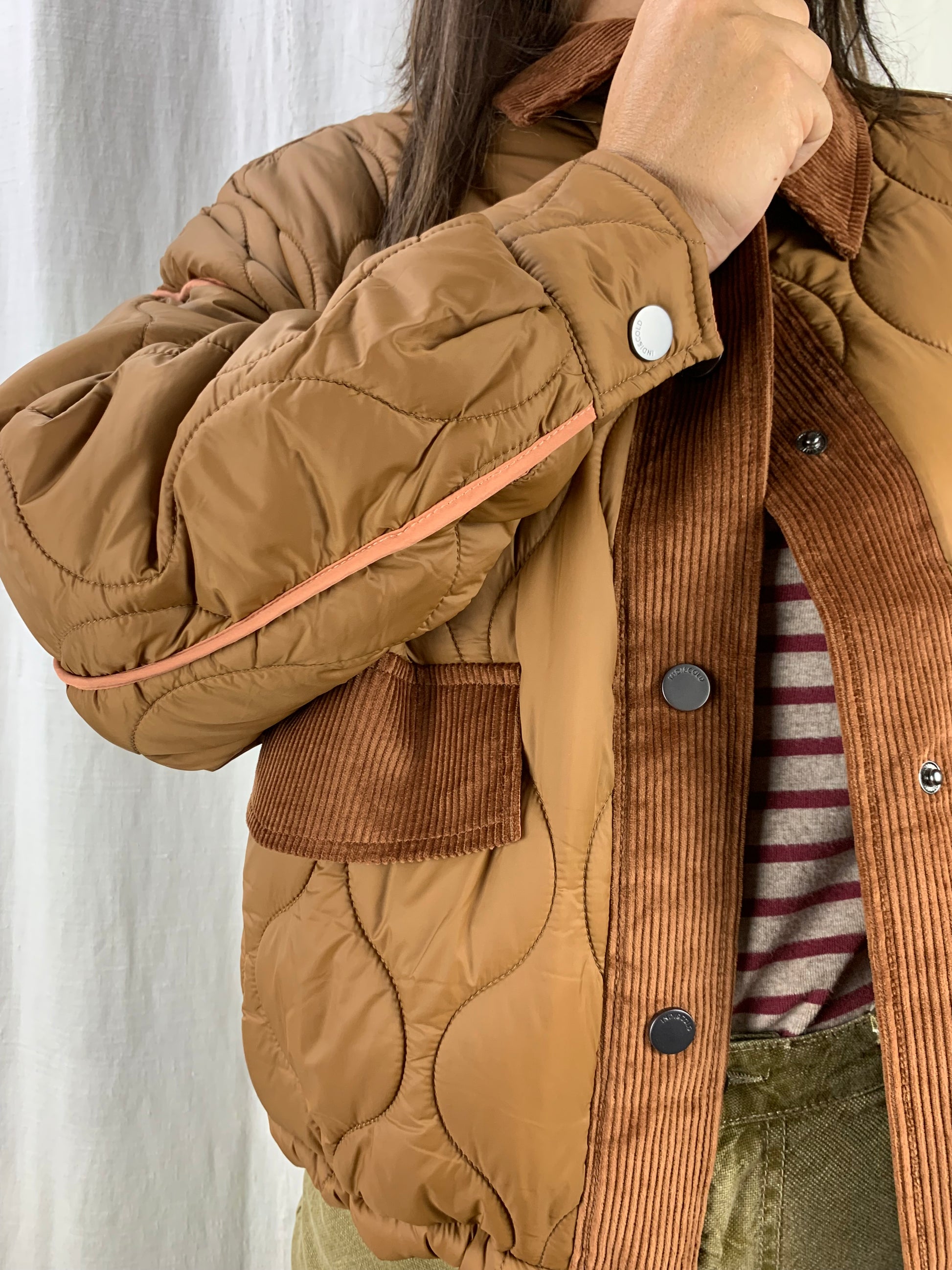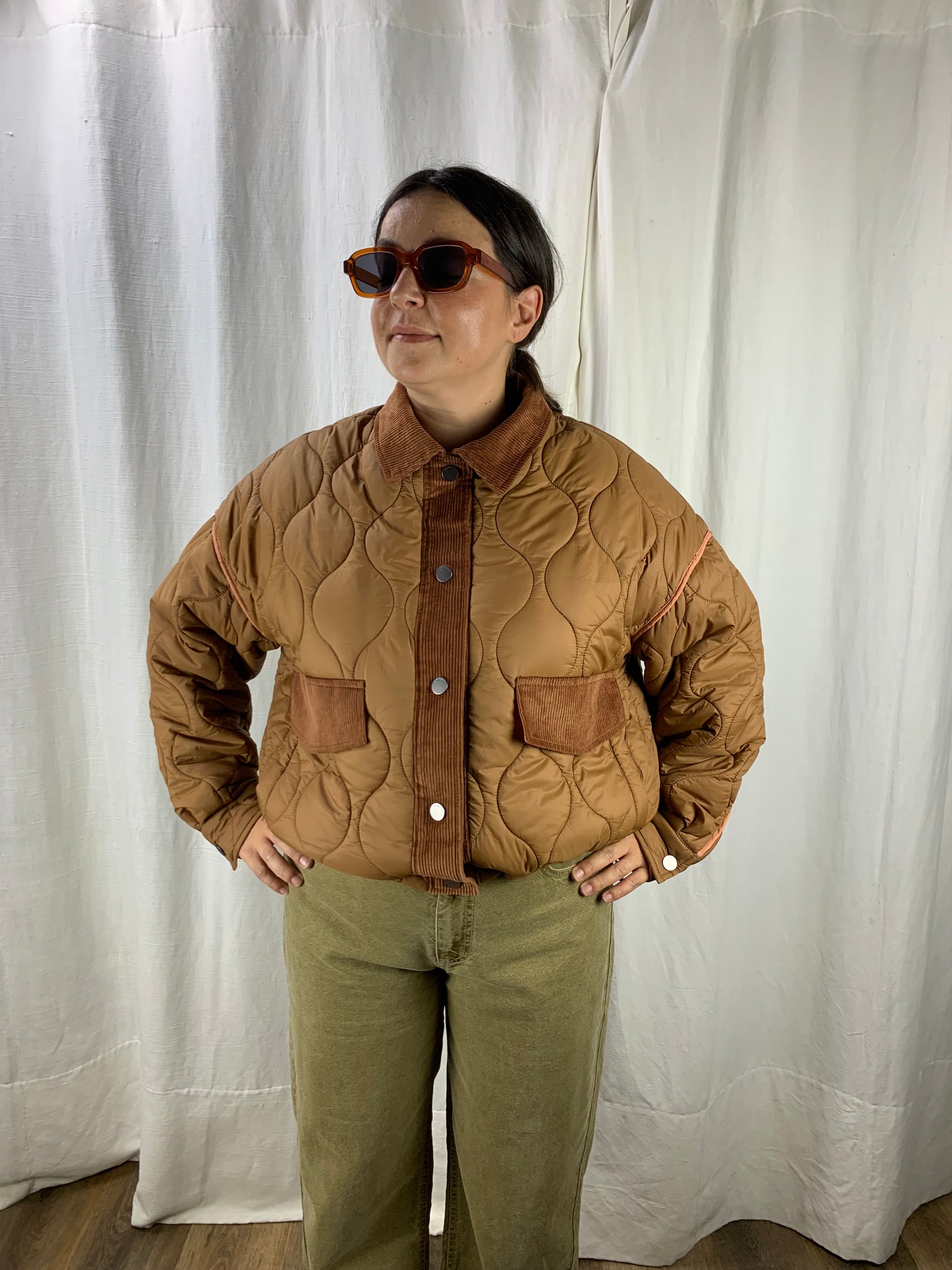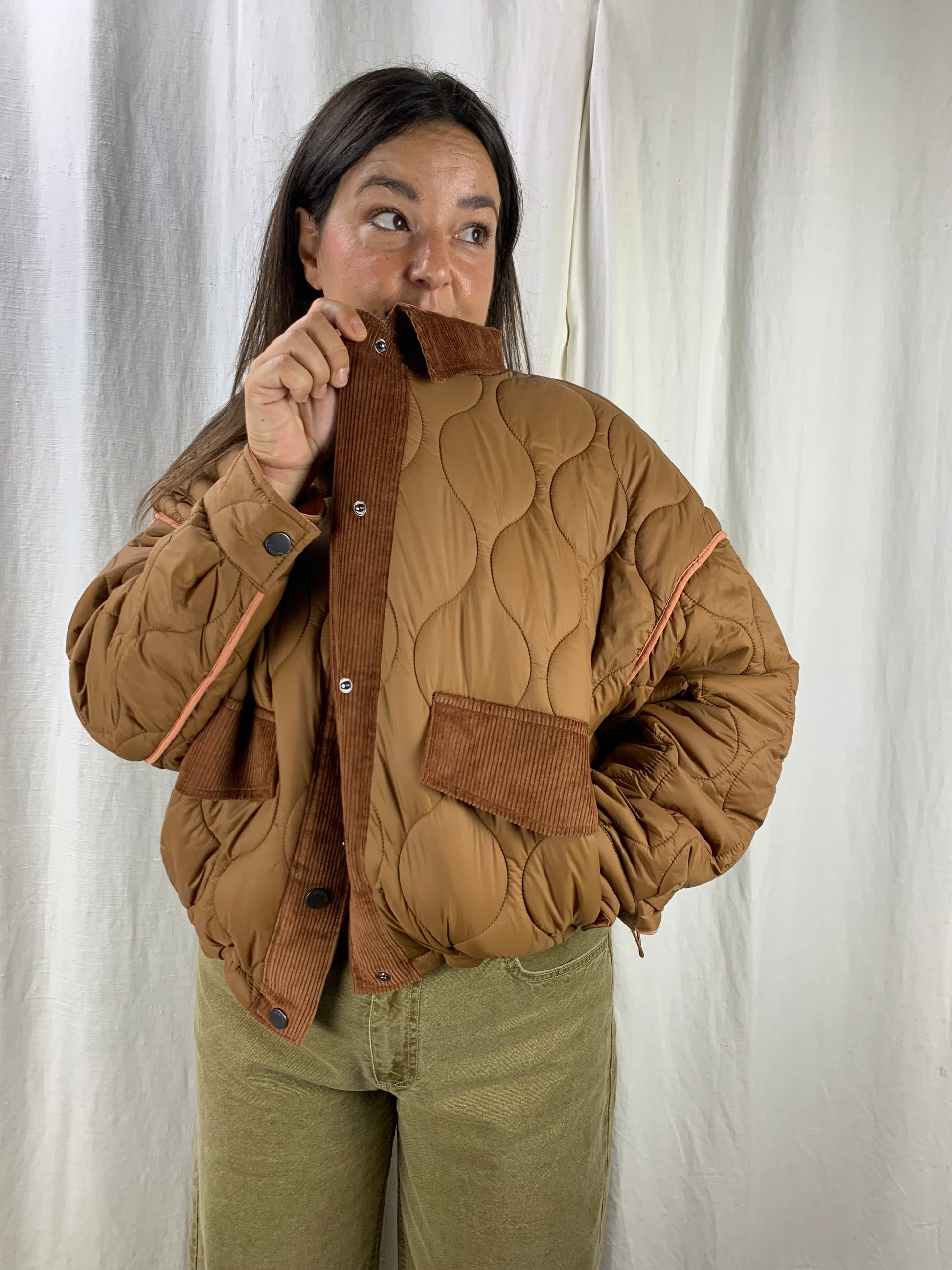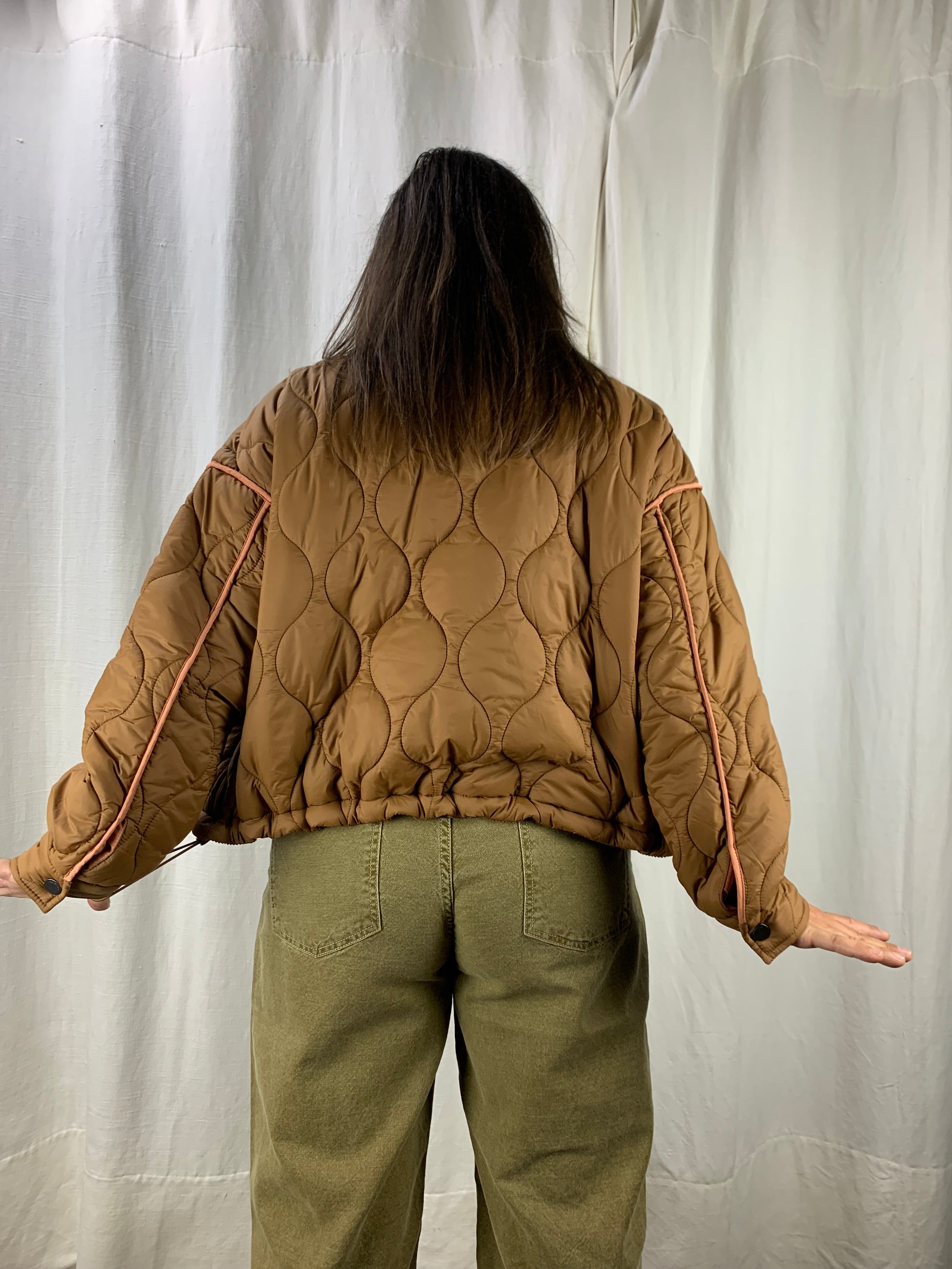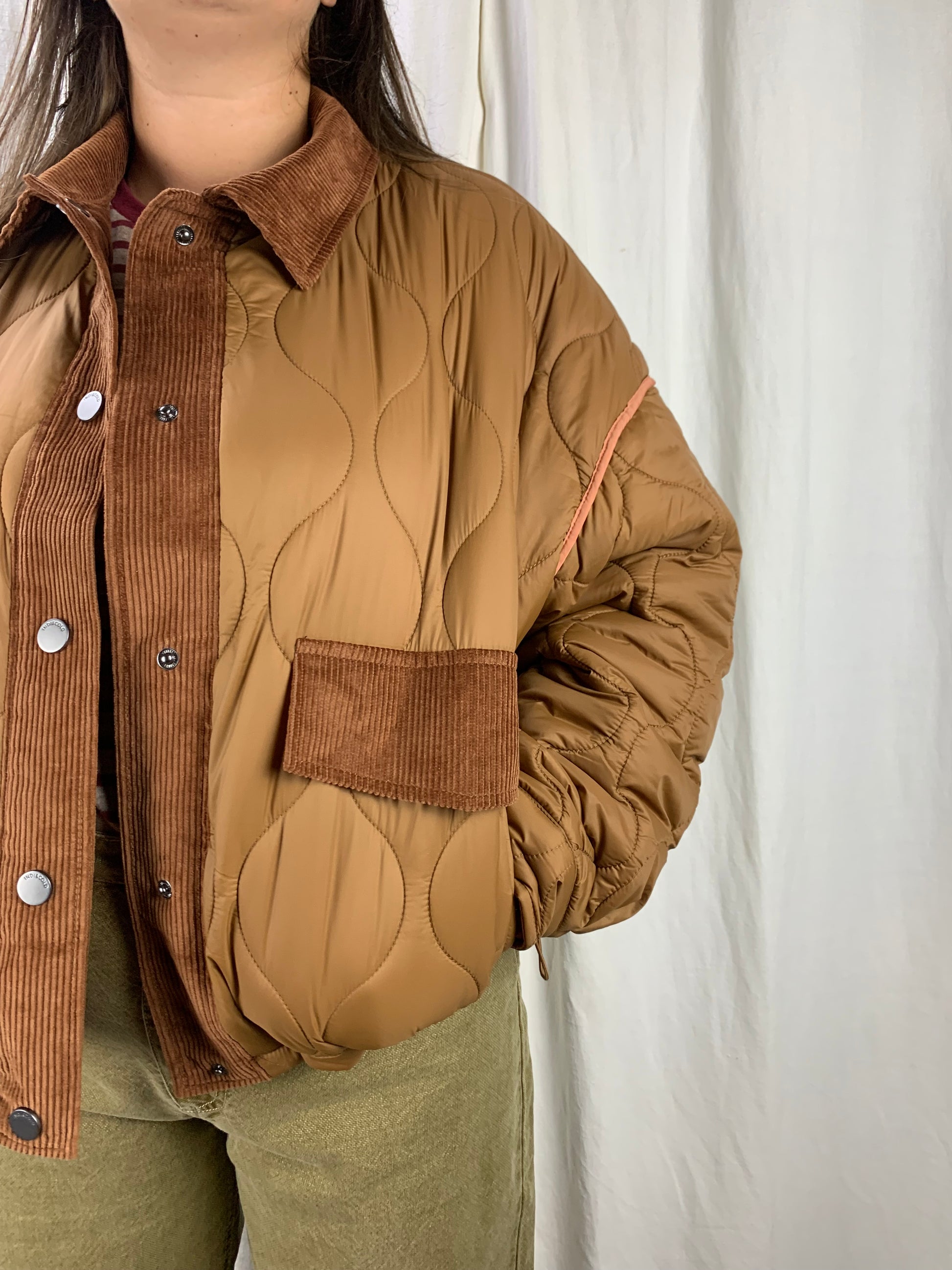 Un bomber con modello giacca di jeans che sicuramente non avrai già nell'armadio.Puoi regolare l'orlo come vuoi lasciandolo liscio e regolare o arricciarlo tirando il pratico elastico.