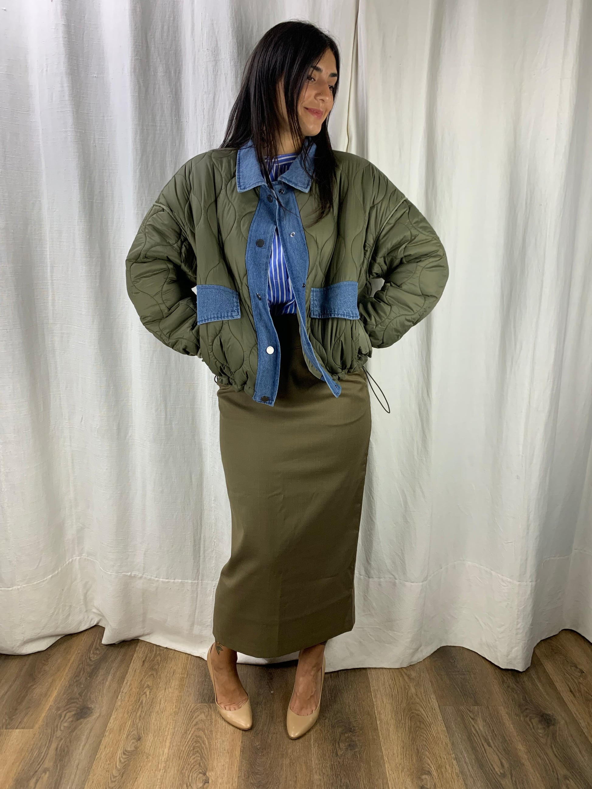 Un bomber con modello giacca di jeans che sicuramente non avrai già nell'armadio.Puoi regolare l'orlo come vuoi lasciandolo liscio e regolare o arricciarlo tirando il pratico elastico.